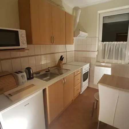 Az emeleti részen lévő szobákhoz tartozik egy edényzettel, étkészlettel, sütő/főző eszközökkel, háztartási gépekkel maximálisan és bőségesen felszerelt konyha, amely teljes körűen kiszolgálja a vendégek igényeit.