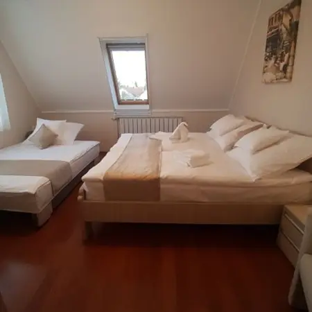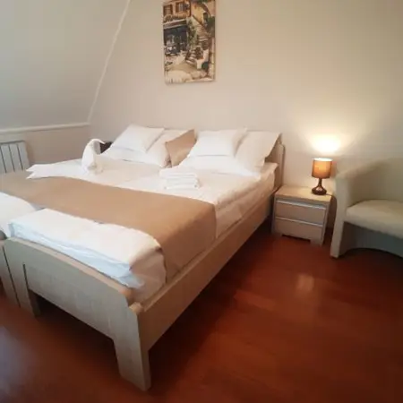 Ebben a superior szobában egy kényelmes Med matracos Ferrara tölgyből készült franciágy található és egy kihúzhatós 2 férőhelyes modern kanapé, így ez a szoba is maximum 4 főre foglalható. Saját fürdőszobája tiszta, igényes zuhanykabinos kivitelezésű. Minden újonnan érkező vendégünk számára kávé és tea bekészítéssel kedveskedünk.