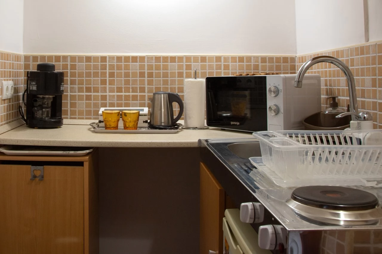 Jól felszerelt kisebb konyha(evőeszközök, tányérok,edények, kávéfőző, főzőlap, hűtőszekrény,vízforraló,mikrohullámú sütő)