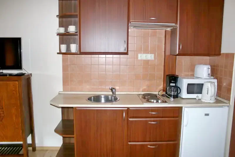 teljesen felszerelt konyha (hűtő, mikrohullámú sütő, elektromos főzőlap, kávé/teafőző, vízforraló, kenyérpirító, edények, evőeszközök)