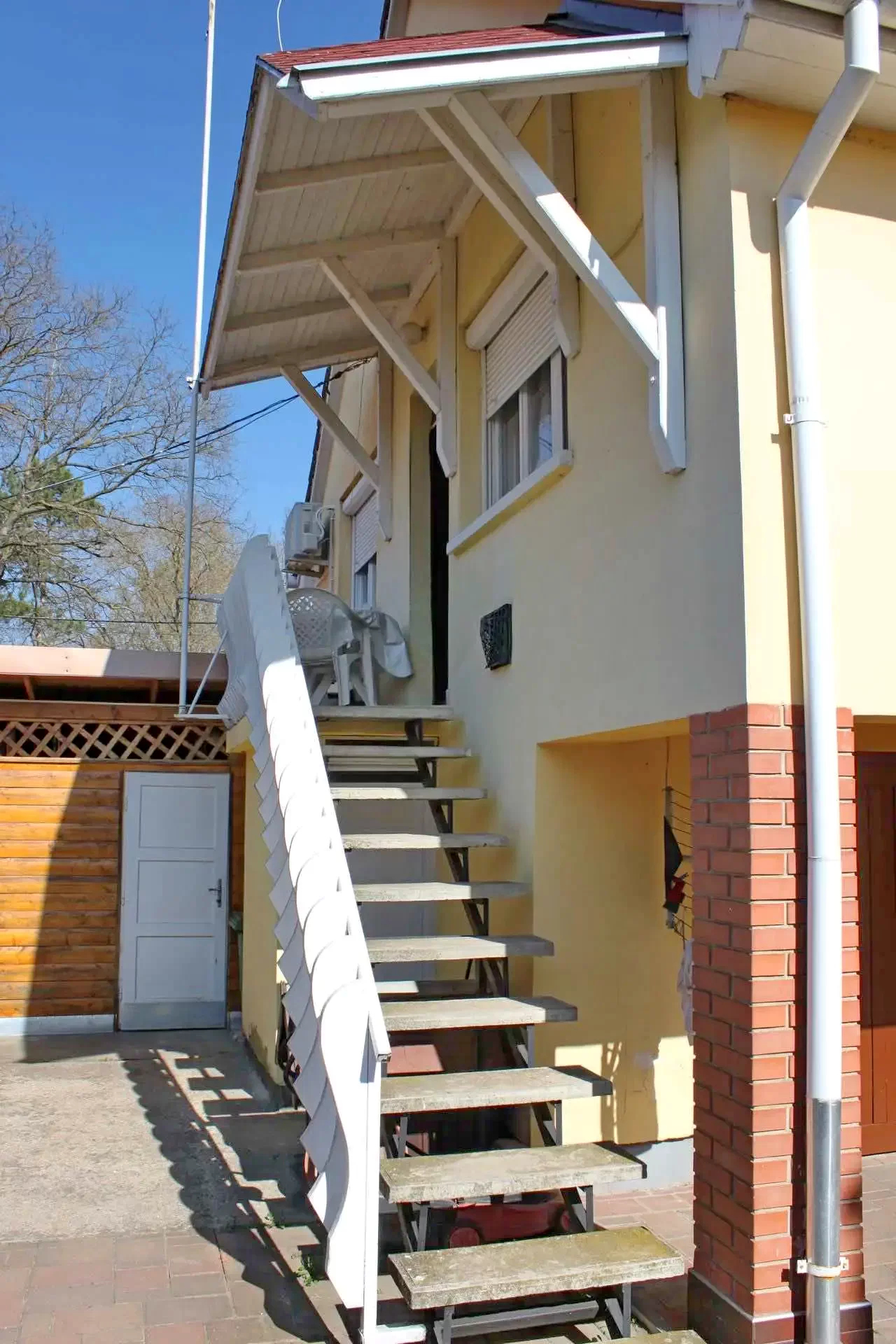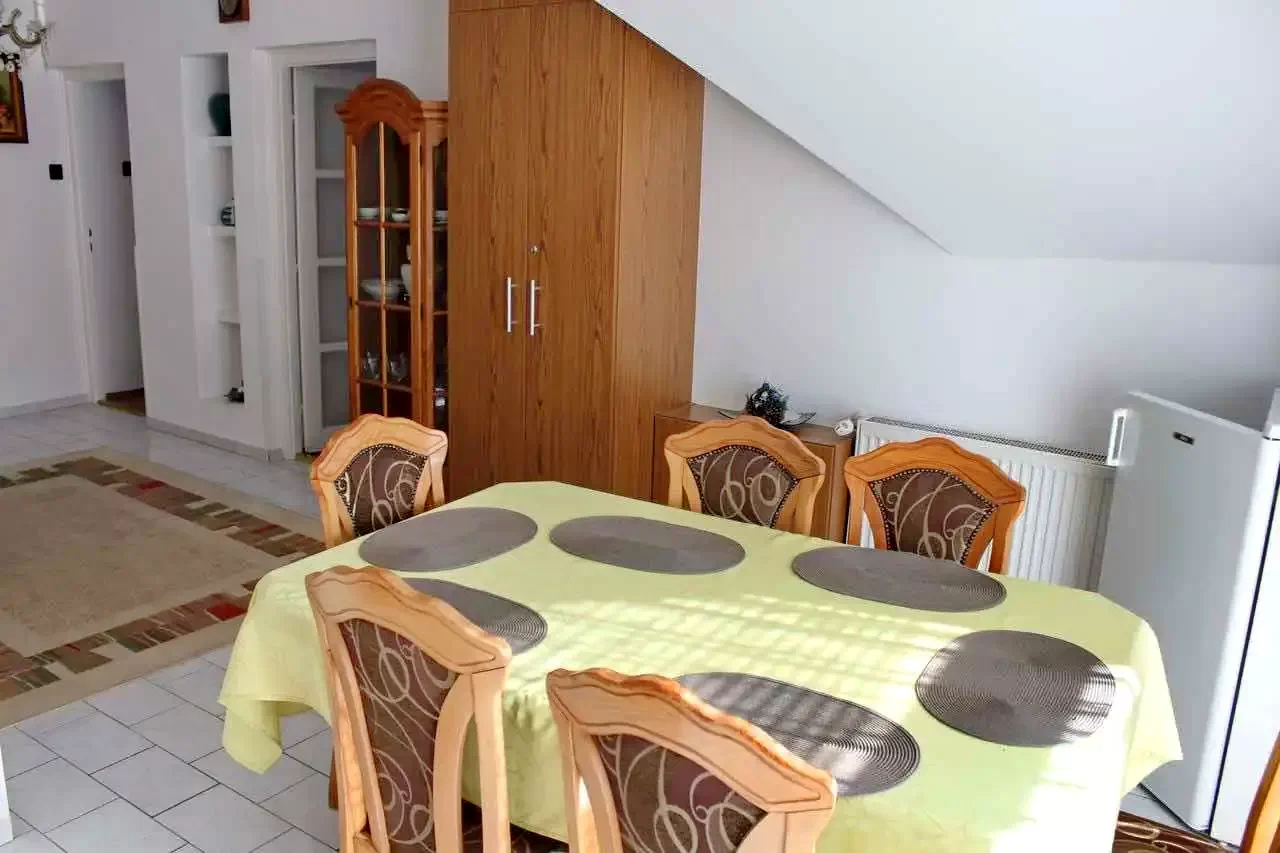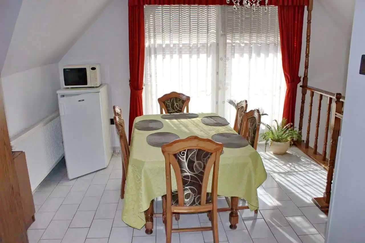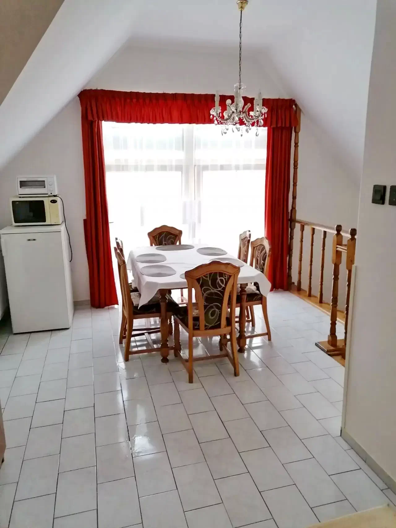 Az emeleti részen van 2 nagyszoba 3-3 ággyal és 1 kisszoba 2 személynek. A szobáknak 2 fürdőszobája van valamint közös a konyhája nagy ebédlővel