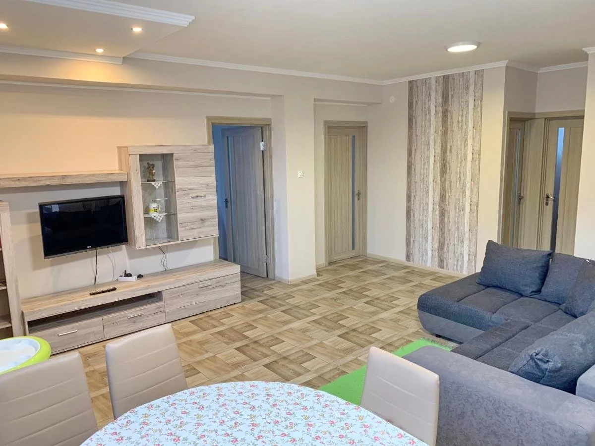 Nappali: Sarokülővel és TV-vel.