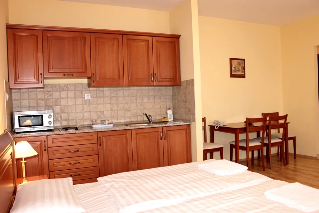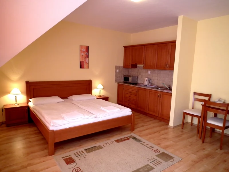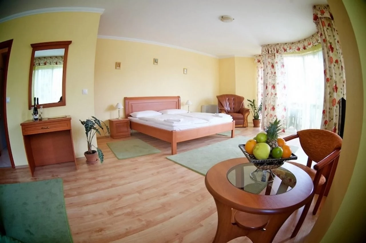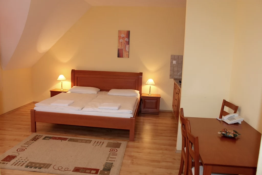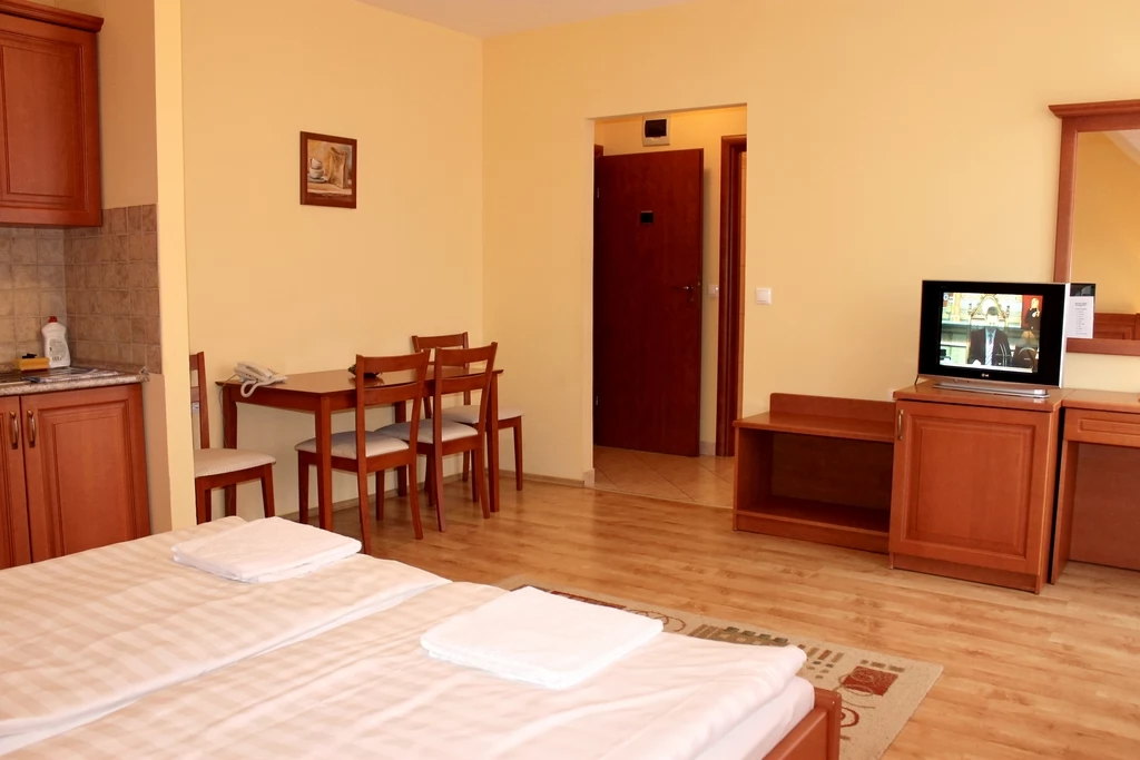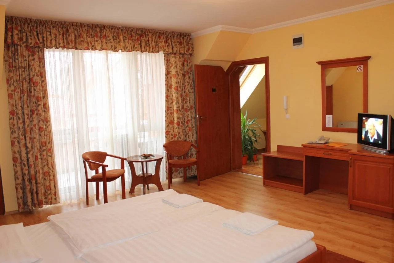 A háromcsillagos Hotel közvetlenül a gyógyfürdő és az Aqua Palace élményfürdő mellett helyezkedik el, mely 6 db apartmannal és 14 db 2 ágyas légkondicionált szobával rendelkezik. Ingyenes teremgarázsból a szobák liftel is megközelíthetőek.