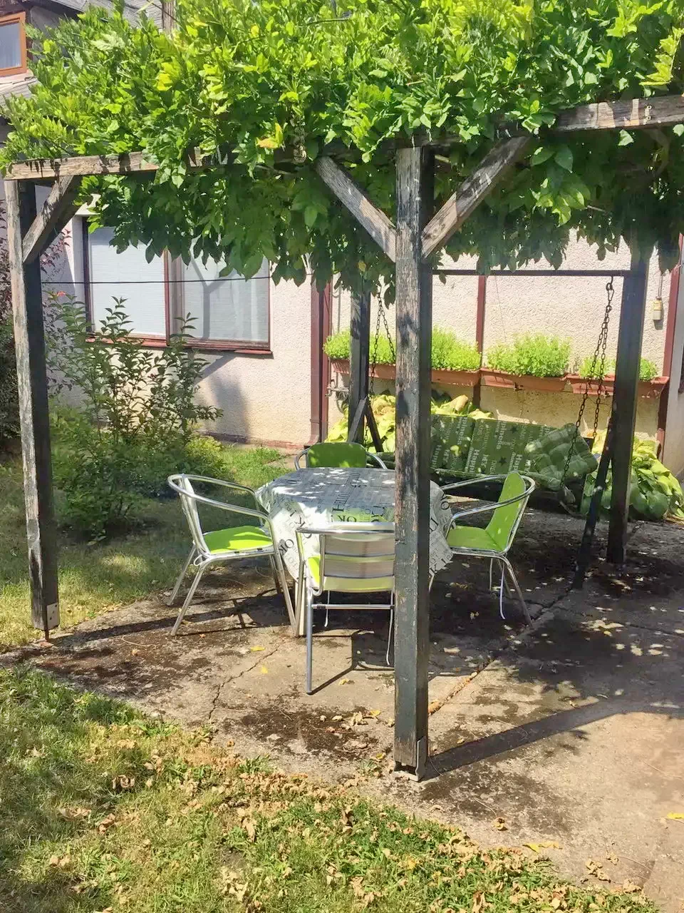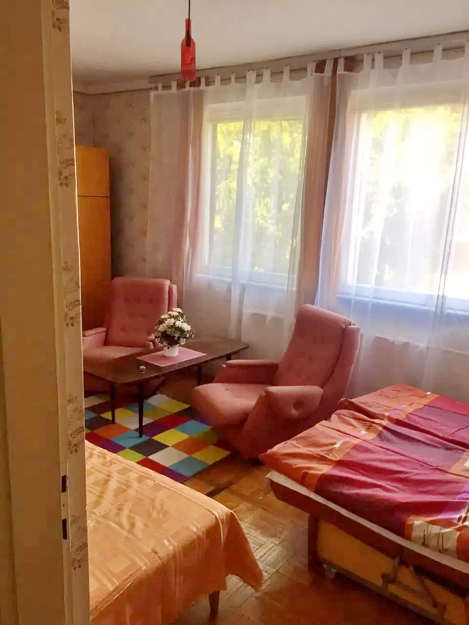 - egy kádas fürdő, mellettel egy külön tusolós fürdőszoba, 2 nagy hűtő a közlekedőn, egy nagy teraszos, 2 ágyas háló szoba (zöld szoba), mellette 3 ágyas szoba (kis piros szoba)