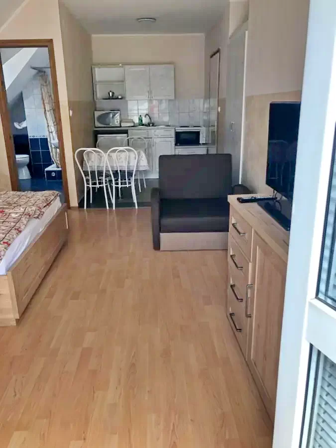 1 db felszerelt konyhával (tûzhely, hûtõ, micro, kávé-,teafõzõ, tányérok, edények, evõeszközök, poharak stb.)