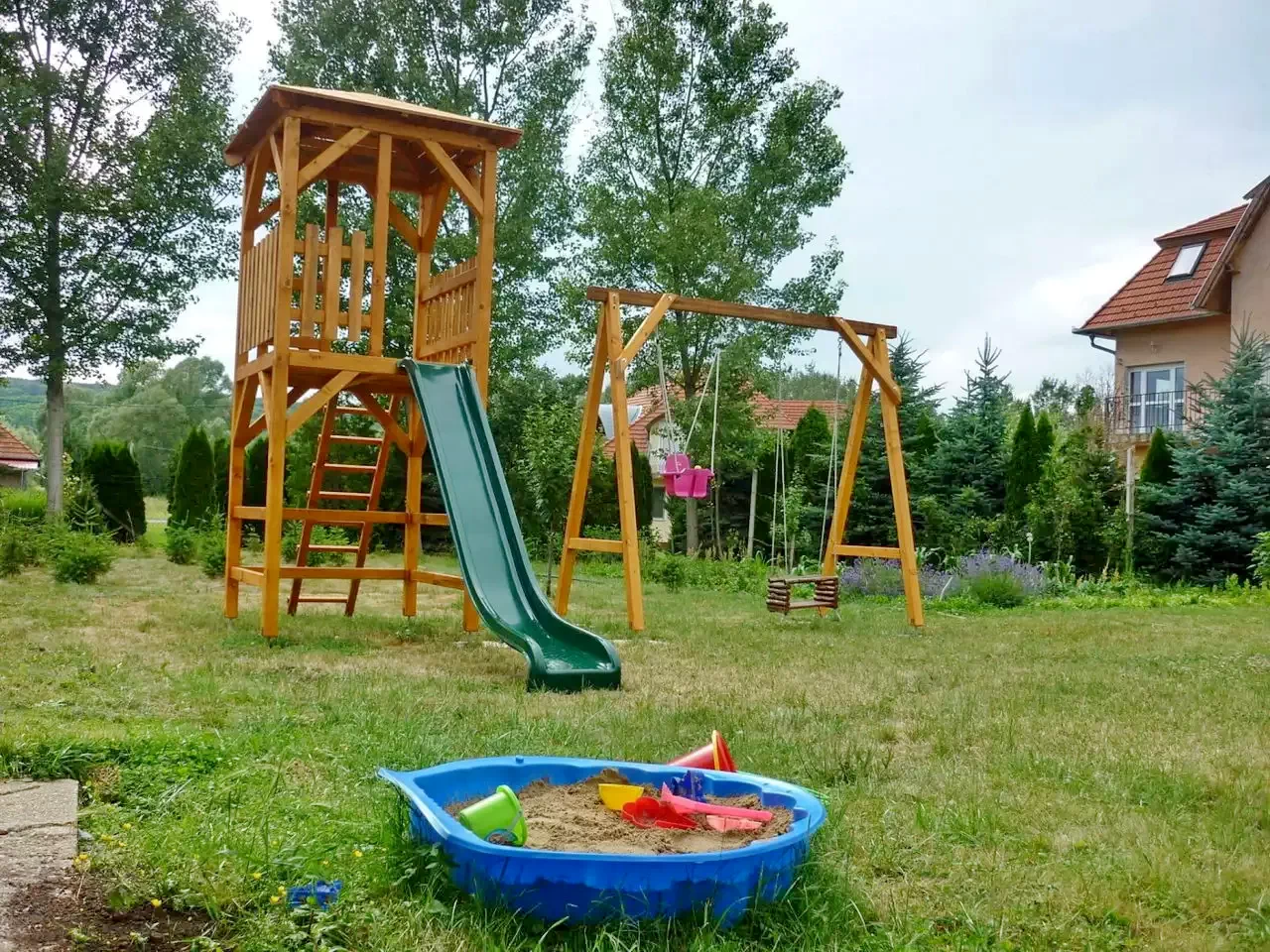 Szükség esetén babaágyat,babakellékeket tudunk biztosítani.Gyermekek részére homokozó,gyermekjátékok.