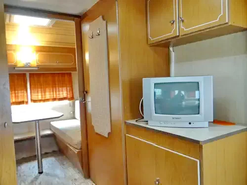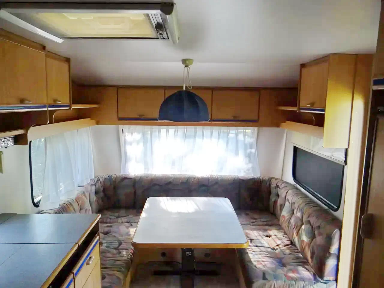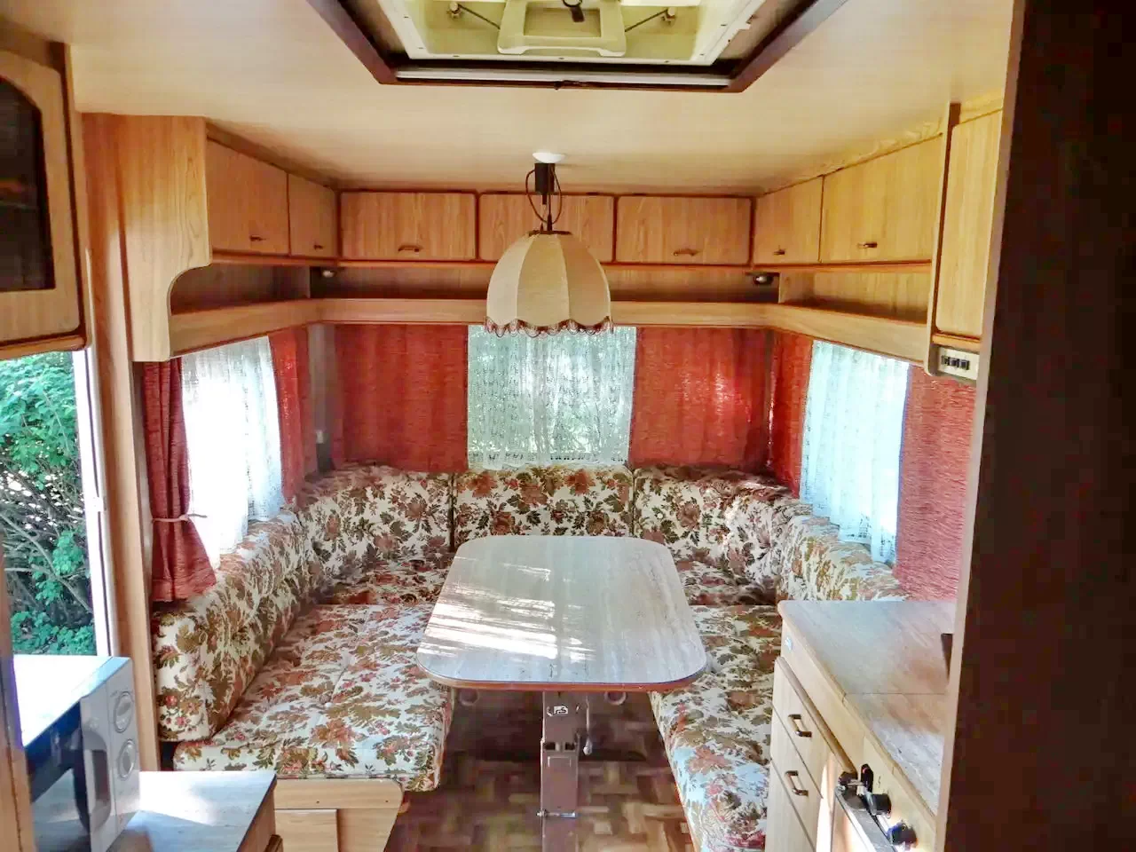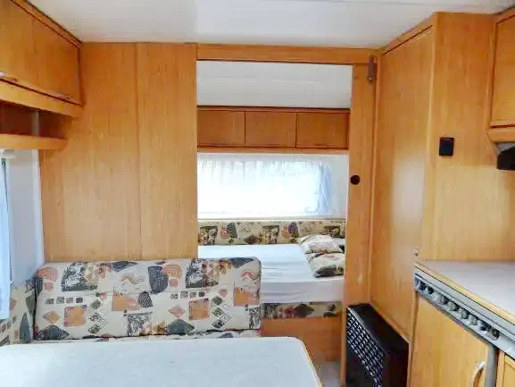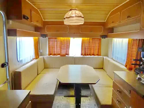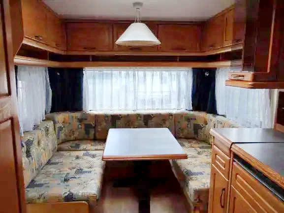a lakókocsi két végében sarokülők, melyek alváskor ággyá alakíthatók,